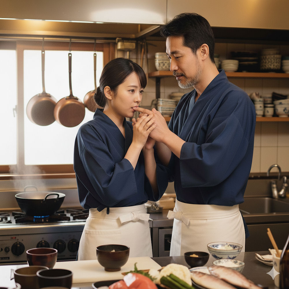 割れたコップで指を切る師匠。上島ら皆の前で血が出ている師匠の指の血を吸う目黒美弥。