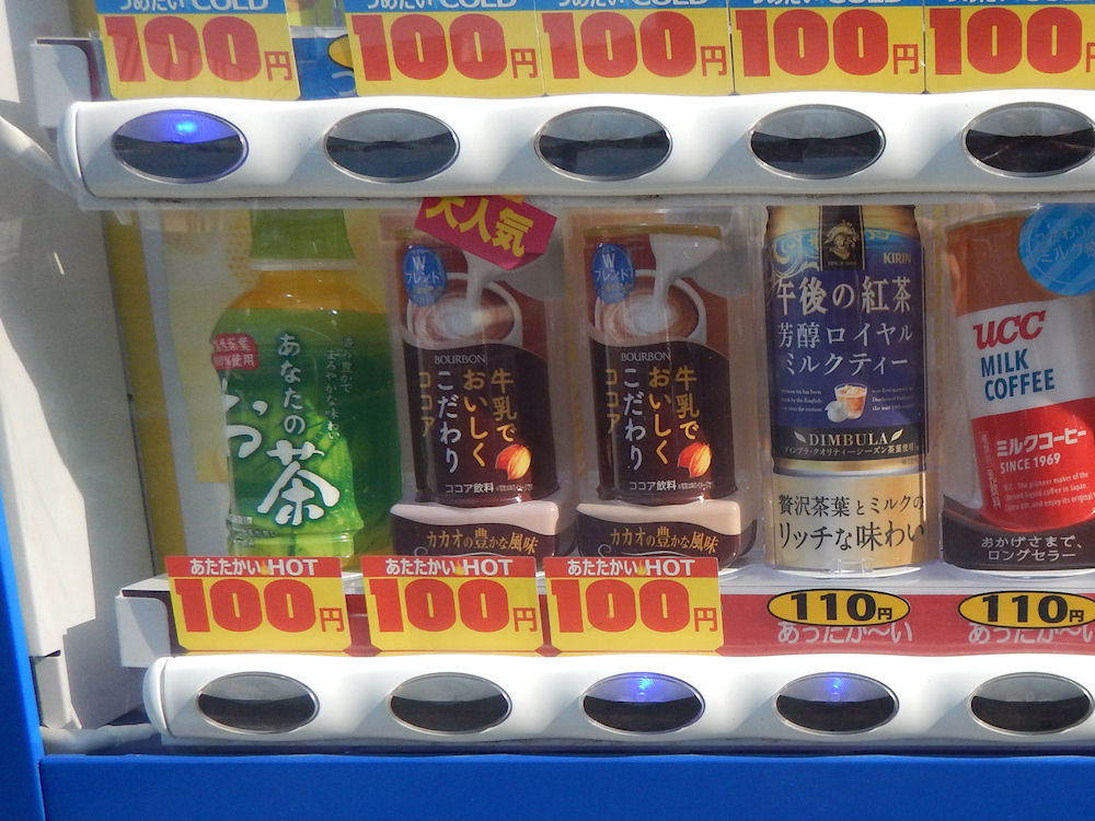 よく利用するドリンクの自動販売機。11月の初めに見た時は、冷たいドリンクだったけど、今日見たら温かいドリンクになっていました。