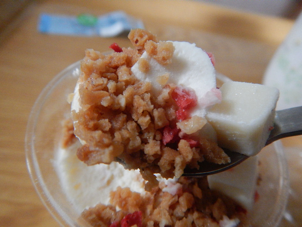 酸っぱいラズベリーソースを食べながら食べると、北海道産チーズクリームとマスカルポーネクリームが、さらに美味しいくなります。最後のカップの底にある、粉々ビスケットとマスカルポーネクリームとの相性抜群!