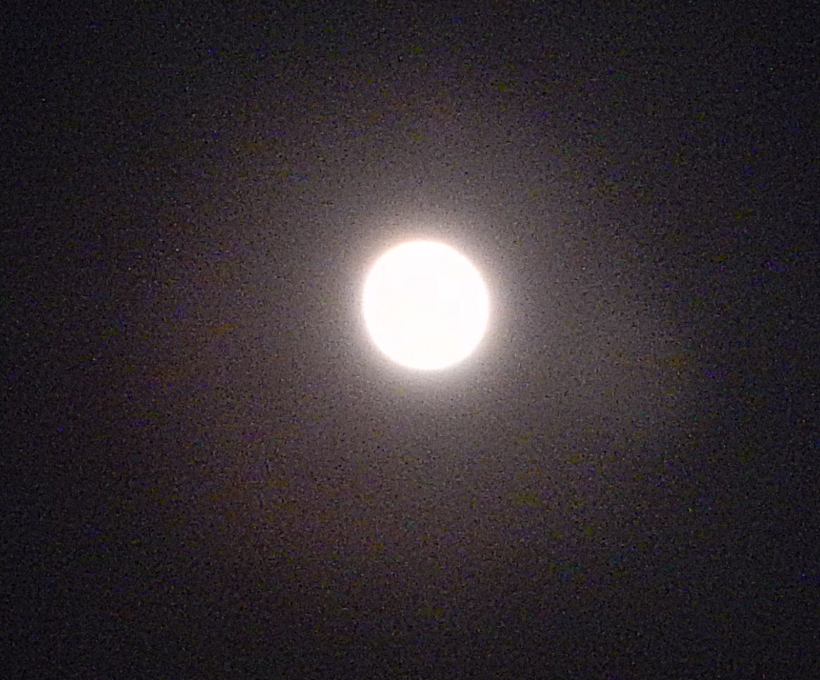 下の写真は、拡大した写真です。ノイズが入ってますけど、丸い月の輪郭が、さらに明るく輝いているのが分かります。