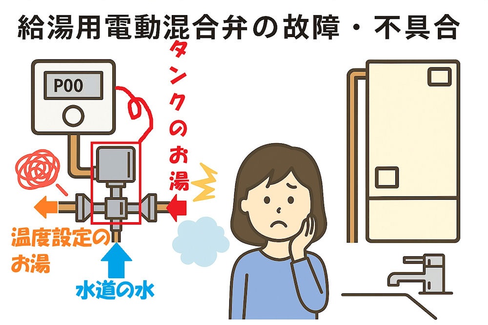 エコキュートは、下のイラストのように、貯湯タンク内のお湯(赤矢印)と、水道水(水色矢印)を混ぜて温度設定のお湯(オレンジ色矢印)をシャワーや蛇口に送るのですが、その設定温度に調節する部品(赤枠)に異常が発生している状態なのです。