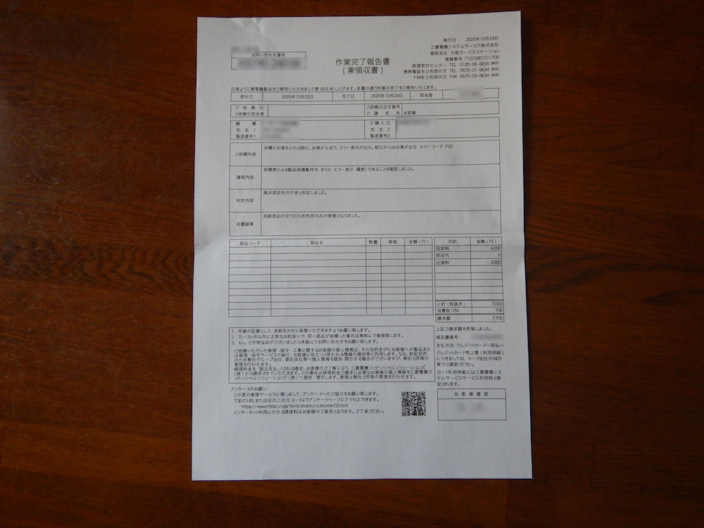 昨日、予約した時間に三菱電機から電話が、かかって来て、不具合の確認や、修理が出来なくても主張費がかかる、修理の日時を予約しました。