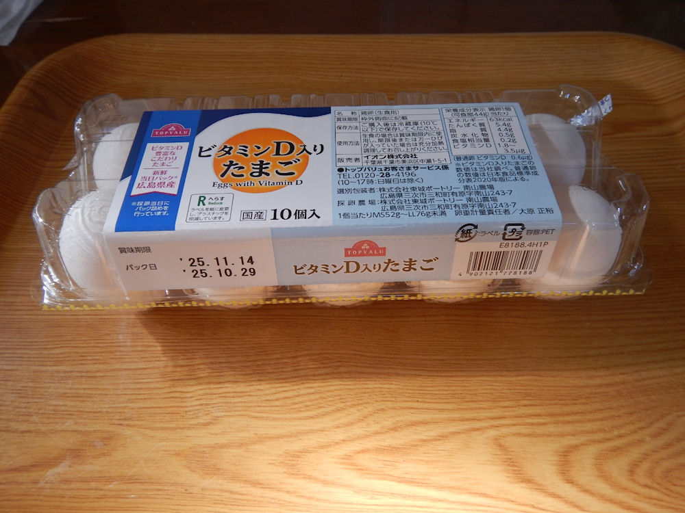 買ったのは、イオンのPB(プライベートブランド)「トップバリュの「ビタミンD入りたまご(10個入り)」。